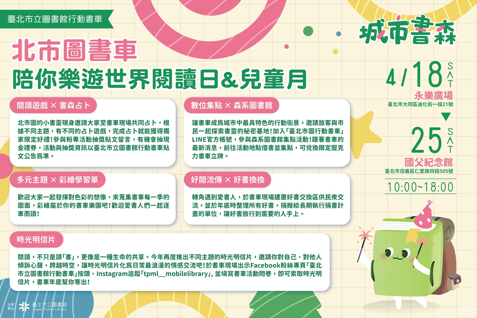 首頁文化活動 響應世界閱讀日 北市圖書車展開閱讀之旅 4月 09, 2026 4月23日世界閱讀日是全球圖書界重要的指標性節日。響應世界閱讀日及臺北兒童月,臺北市立圖書館「城市書森」行動書車4月再度啟動,將前往迪化街永樂廣場與國父紀念館,帶領大小朋友走進書本世界,享受閱讀樂趣。本文由AI編輯,來源:國立教育廣播電台